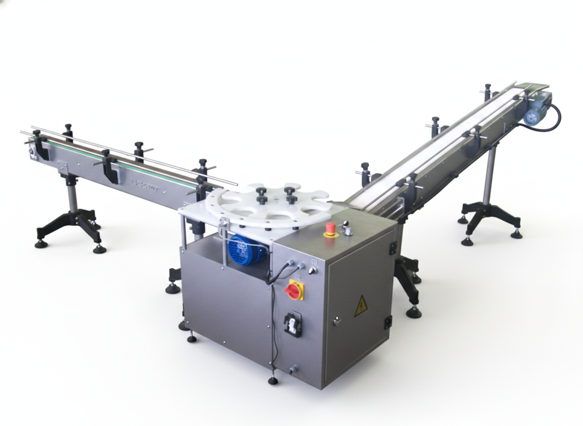 The feeding table, which ensures that empty packages are supplied to the production line in an orderly manner, and the collection table, which accumulates filled products and prepares them for the case-packing stage, are practical auxiliary units that can be used at the inlet and outlet points of the line.
