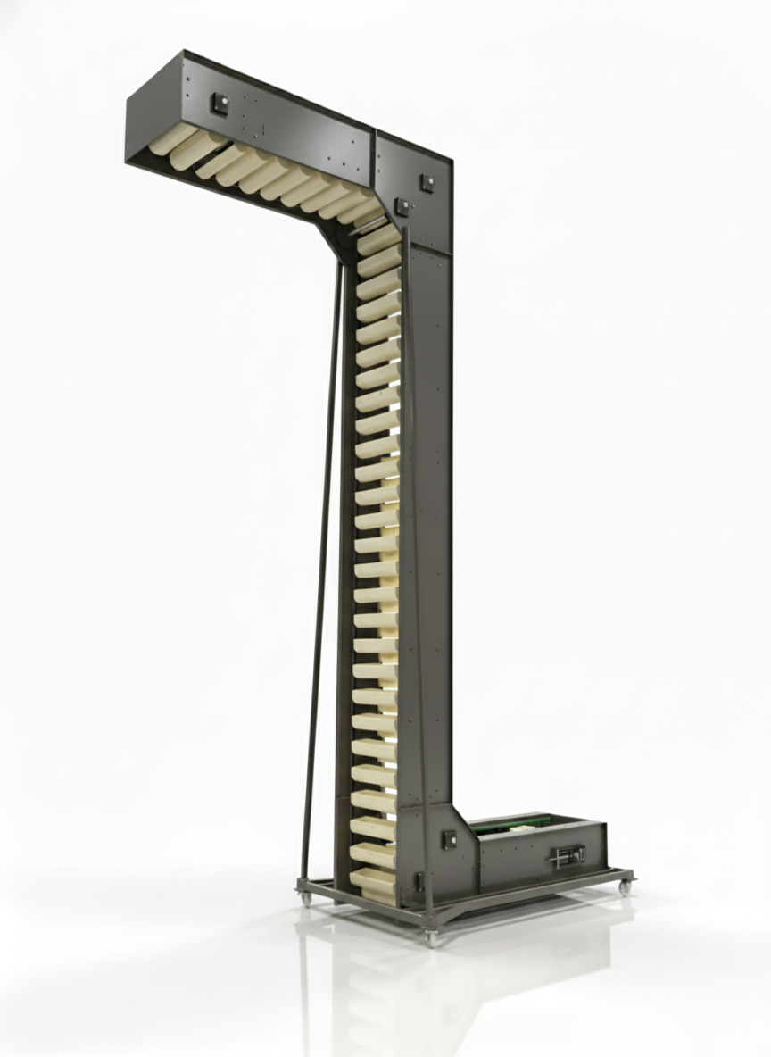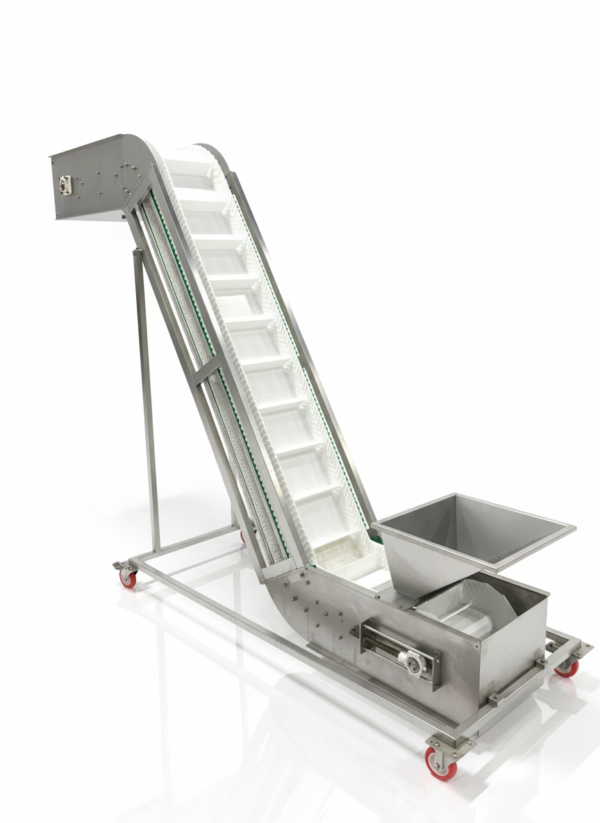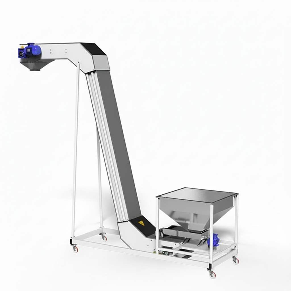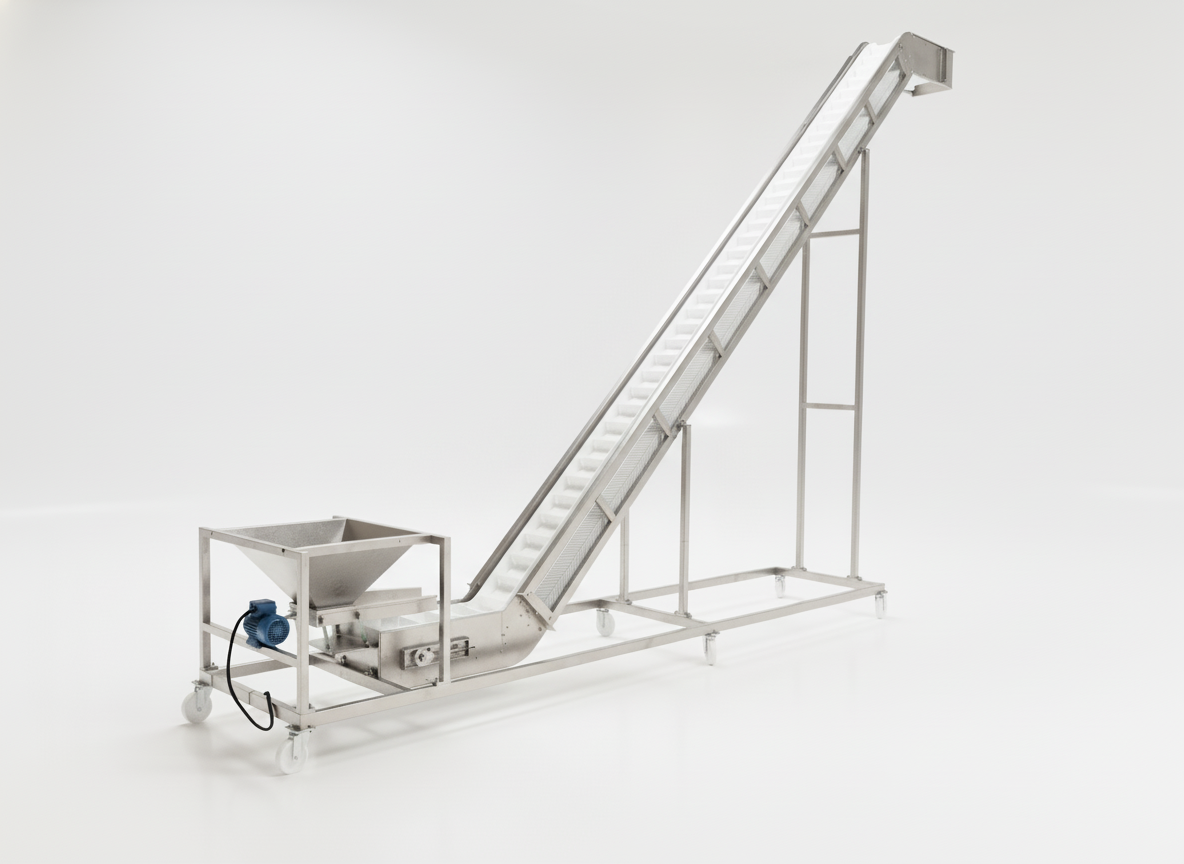 Elevator systems are industrial elevator conveyor systems that enable the controlled and safe transport of bulk products within the production line. Developed for conveying nuts, legumes, and similar particulate products, this structure ensures that products are transferred homogeneously without breakage or spillage thanks to its vibratory feeding unit and food-grade conveyor belt.