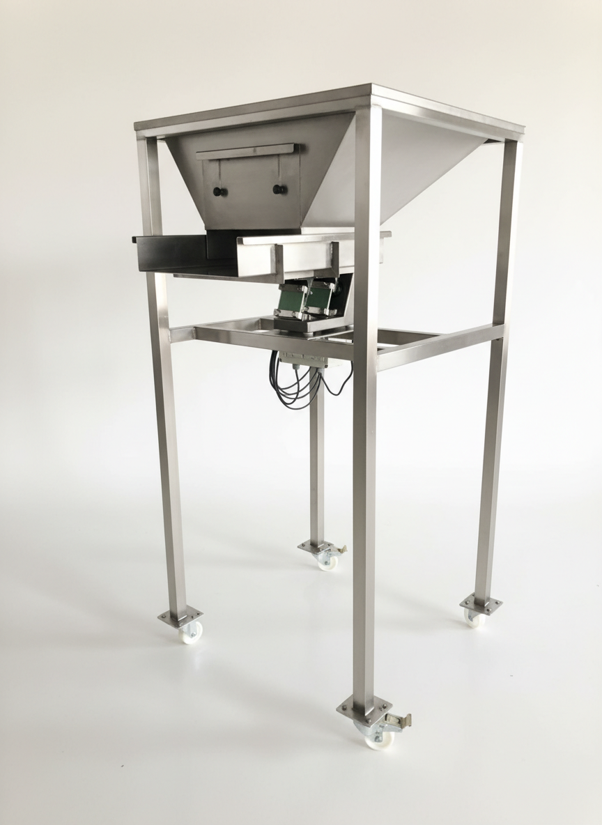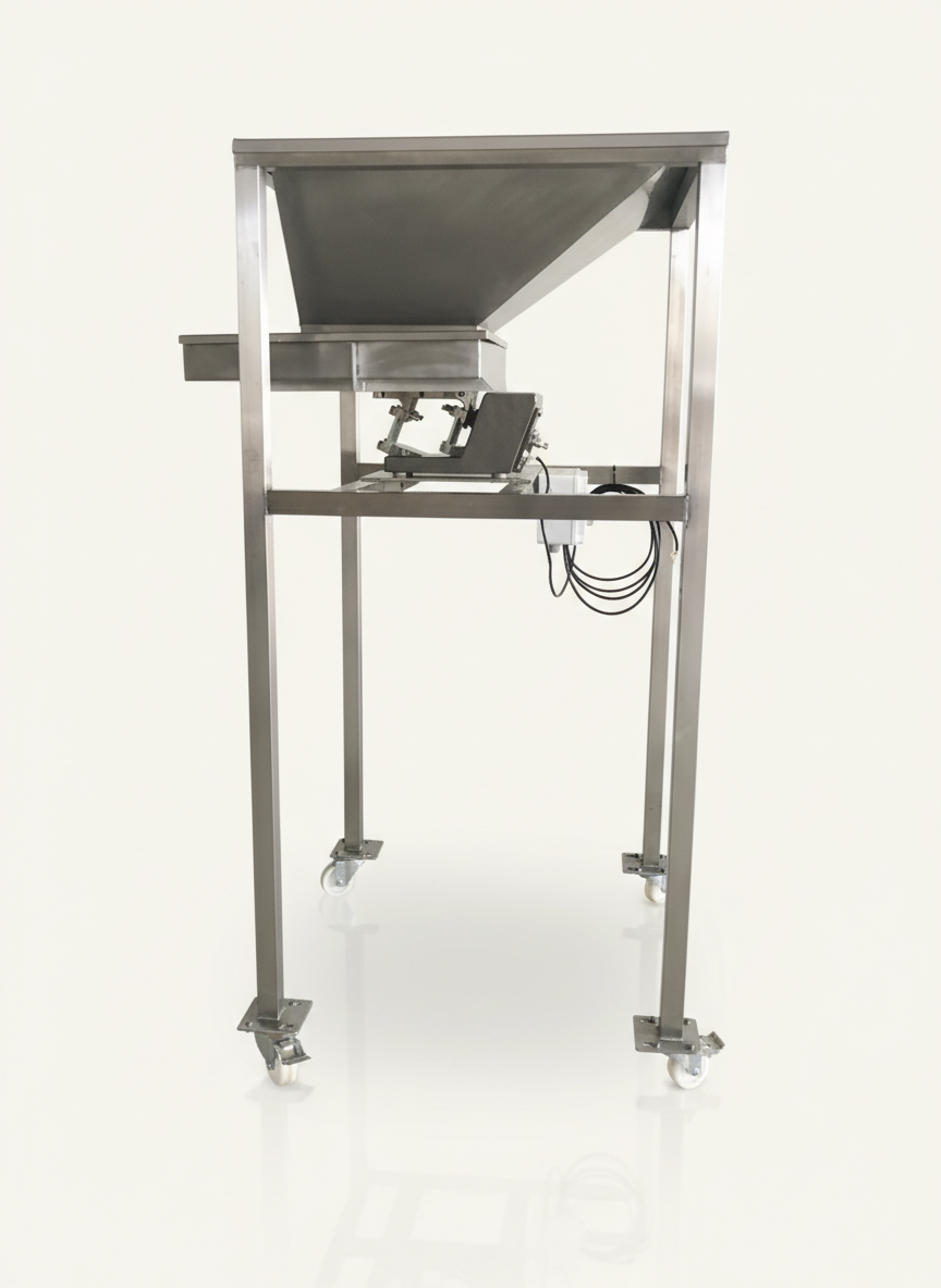 Thanks to its lockable wheeled leg system and modular design, the vibratory feeder can be integrated easily into different production lines, carrying out product transfer in a controlled, balanced, and reliable manner and offering an efficient feeding solution in modern production facilities.